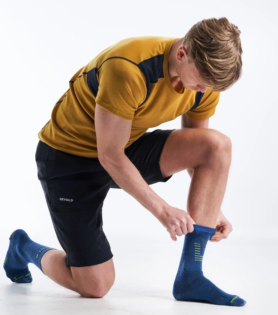 Les Hiking Merino Light Sock Man de la marque norvégienne Devold sont des chaussettes hautes en laine de mérinos. Elles sont conçues spécialement pour la pratique de la randonnée. Fines, ces chaussettes sont légères et douces, avec des caractéristiques de thermorégulation. Des champs de mailles dans des endroits stratégiques assurent une bonne ventilation.