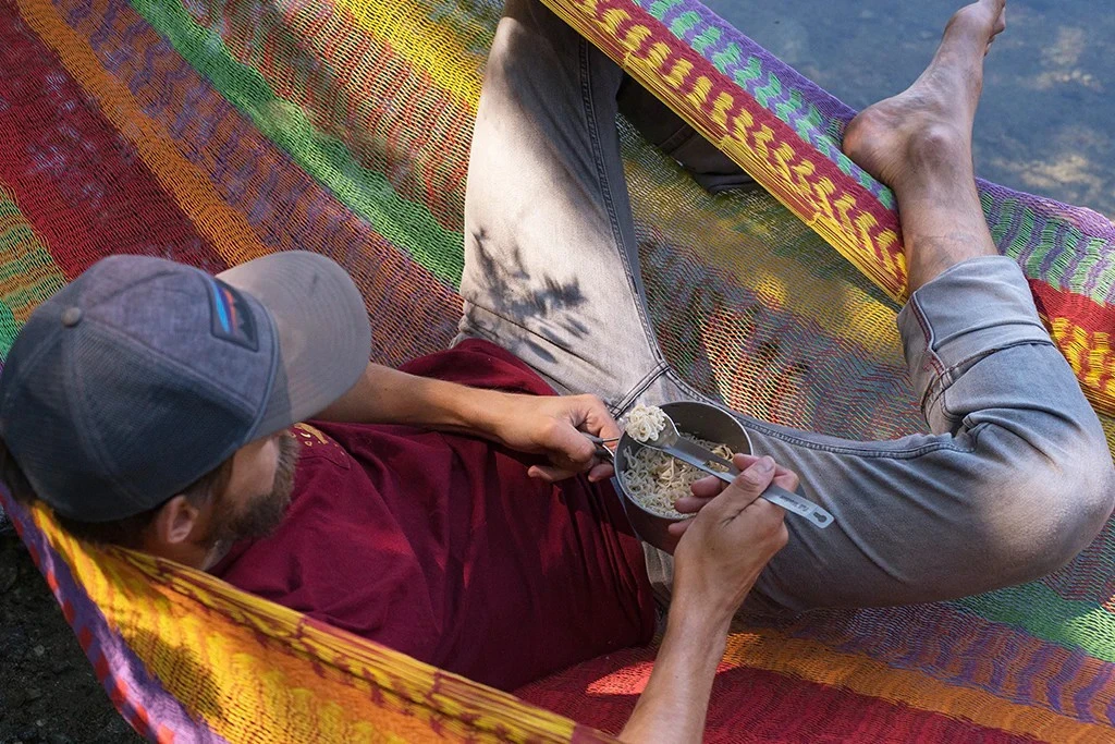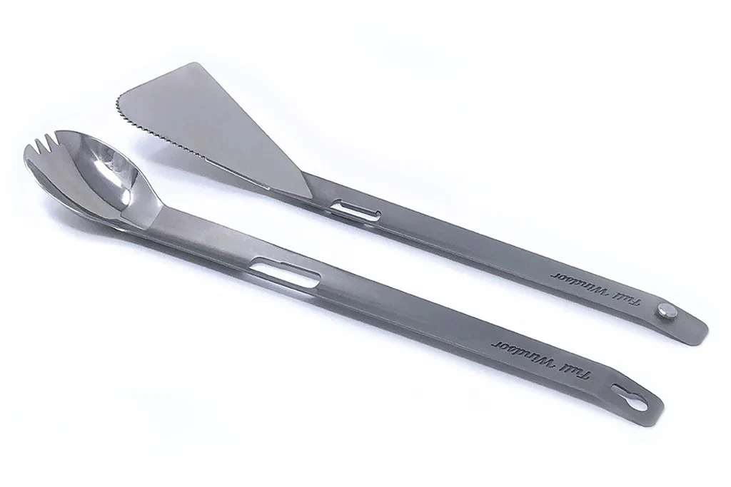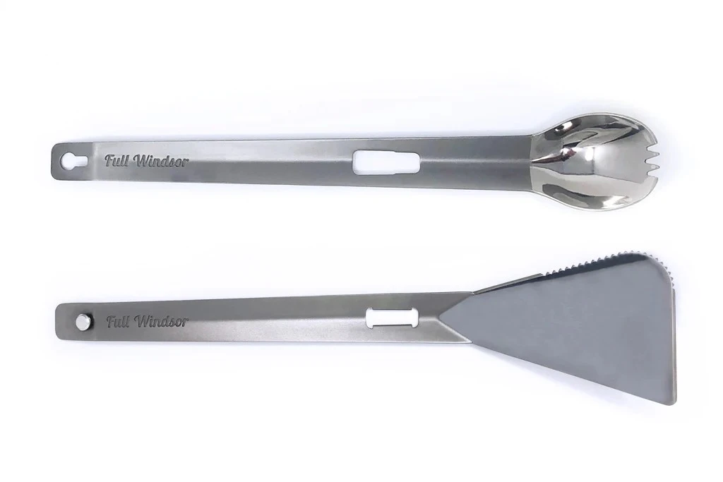 The Splitter de la marque californienne Full Windsor est un outil multifonction en titane à utiliser au camping, lors de soirées barbecue ou lors d’itinérances. Il se compose d’une grande cuillère et d’une spatule de 25 cm de long chacune. La cuillère possède 3 petites dents (spork) et peut aussi faire office de fourchette. Avec son long manche, il est facile d’aller au fond des sachets de lyophilisés ou de n’importe quel récipient. La Spatule a un bord lisse, très pratique pour râcler, et un bord denté pour couper les aliments.
