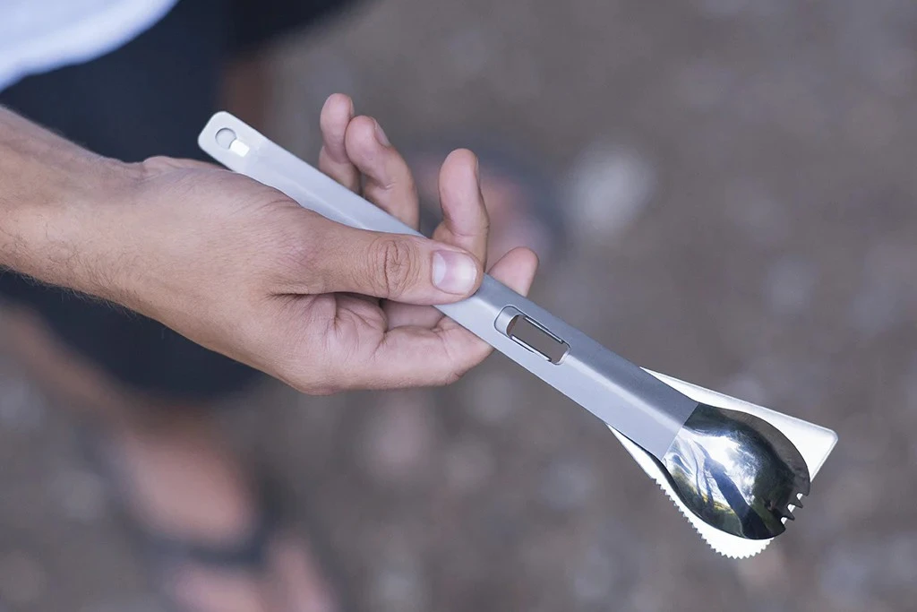 La cuillère et la spatule peuvent se regrouper pour former une pince. Une goupille en acier inoxydable sur le haut de la spatule et un trou dans la cuillère permettent de former cette pince très rapidement. Le titane est naturellement flexible, la pince a donc une force de préhension parfaite. Pratique pour retourner les aliments sur le barbecue, préparer des bons petits plats au camping et les déguster ensuite.