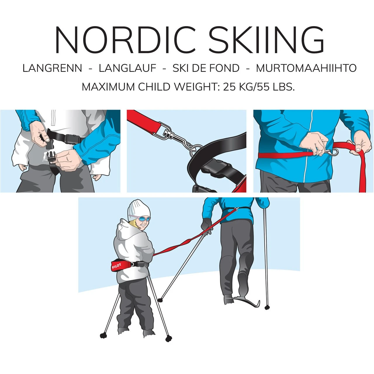 Le harnais Swix est conçu pour cela ! Il permet d’aider votre enfant à contrôler la descente et à le soutenir dans une montée. Cette sangle convient aux enfants âgés de 2 à 5 ans. Ce harnais se fixe au niveau de la taille de votre enfant (sangle de passage entre les jambes). Il comprend une sangle de remorquage de 5,5 mètres à fixer autour de votre taille. Sur le harnais, 2 boucles latérales en acier inoxydable permettent de fixer cette sangle. Cette dernière se range dans la poche zippée du harnais lorsque vous ne l’utilisez pas.