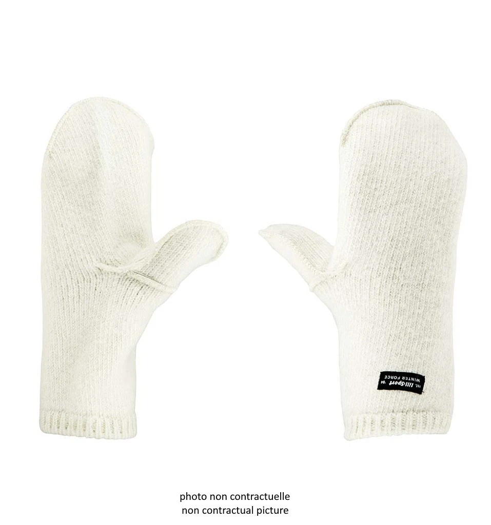 A l’intérieur se trouve une seconde moufle en laine, pour un apporte de chaleur supplémentaire. Une épaisse doublure 100 % laine tricotée, très chaude, qui conserve ses propriétés isolantes même mouillée. Fixée par velcro (non visible sur la photo de présentation), elle est amovible et peut être utilisée indépendamment.