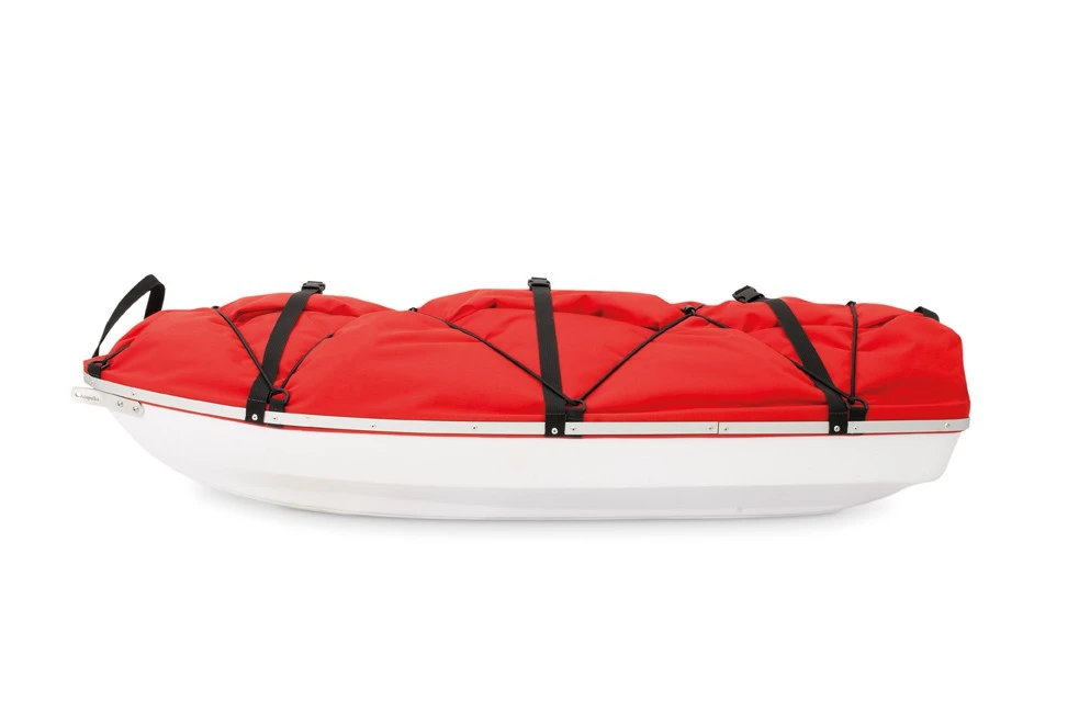 La housse cousue en nylon Cordura est résistante à la déchirure et à l’abrasion. Elle est équipée d’un long zip YKK 10 mm avec double curseur facile à manipuler avec des gants et des moufles. Sur le dessus, la pulka est équipée d’un cordon élastique de serrage + de 3 sangles de compression transversales en polyester + 2 sangles de portage.