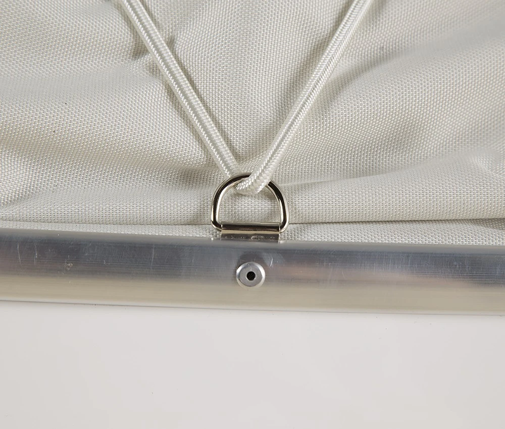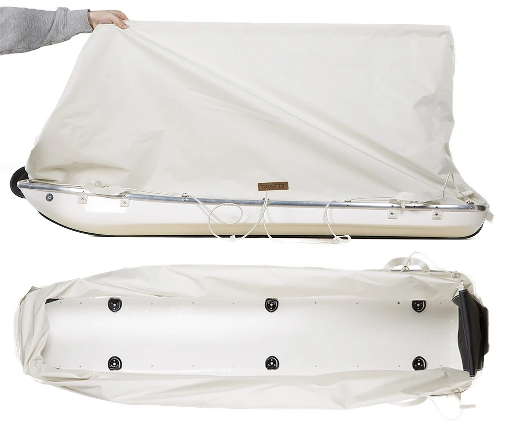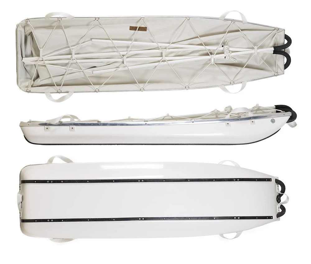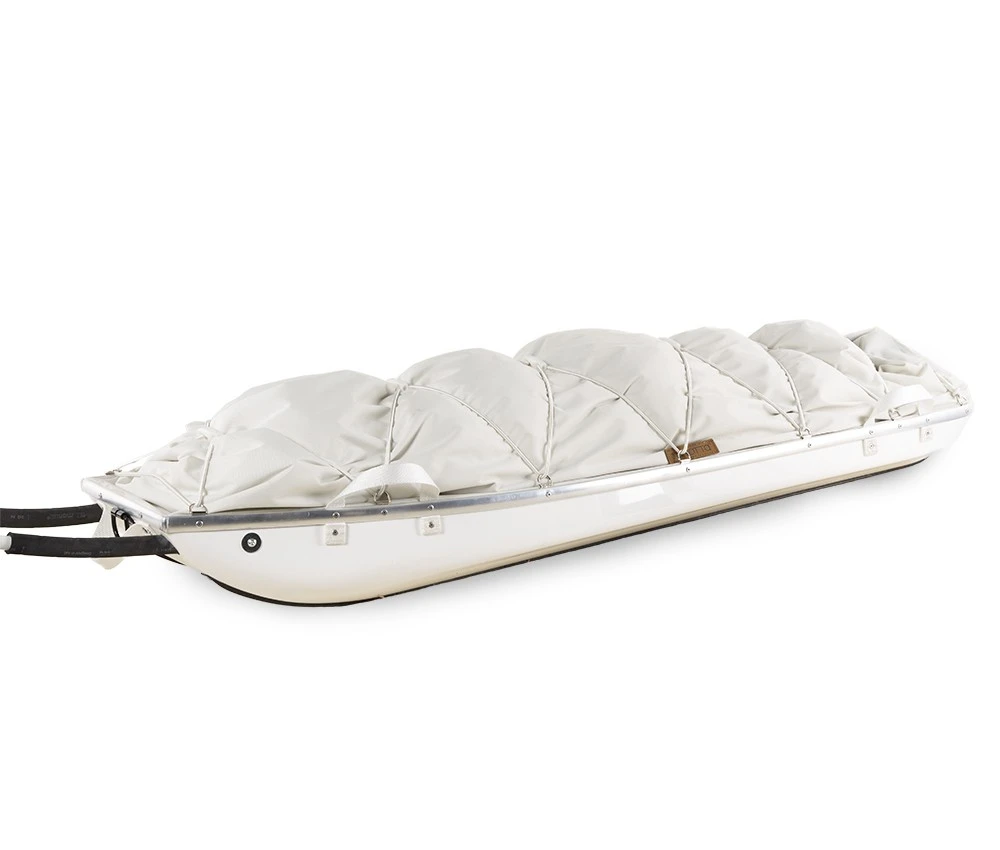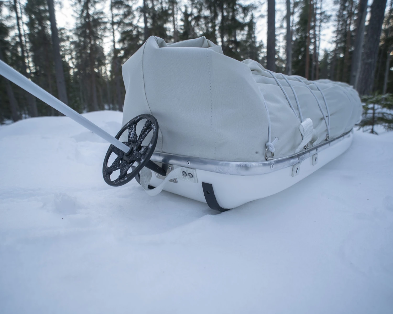 La pulka est équipée d’une bâche solide blanche qui permet de protéger votre équipement. En haut de cette bâche, 2 tiges en acier permettent d’optimiser la fermeture par enroulement. Au-dessus de la bâche un cordon élastique avec crochet permet d’arrimer solidement votre chargement.