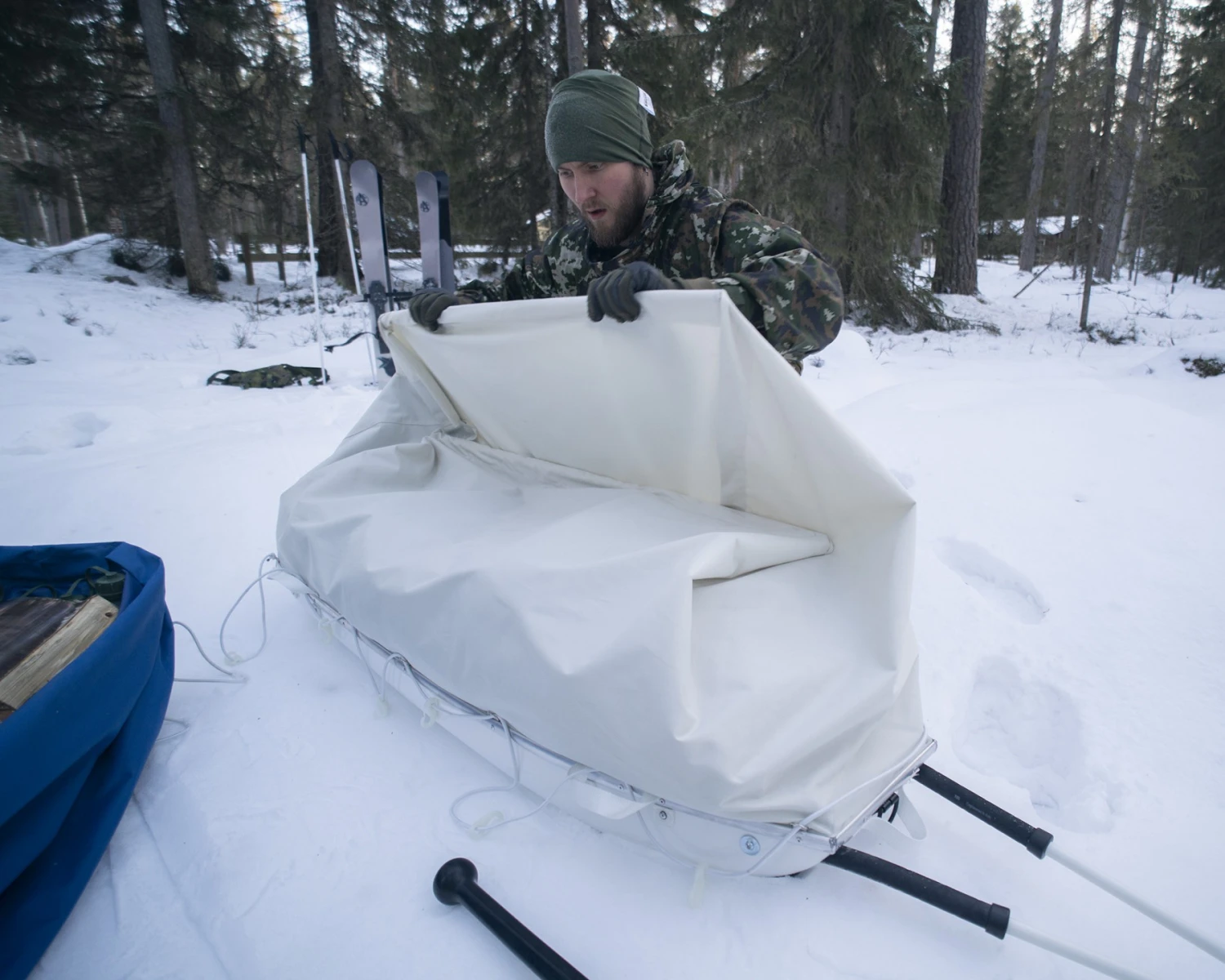 Les pulkas Border livrées par Savotta ont toutes des bâches blanches qui ne sont pas totalement blanches : des petites traces peuvent être présentes à la livraison liées aux manipulations à l’atelier de production de Karstula en Finlande. Production artisanale, pulka fabriquées à la main > Elles ne sont pas faites à la machine.