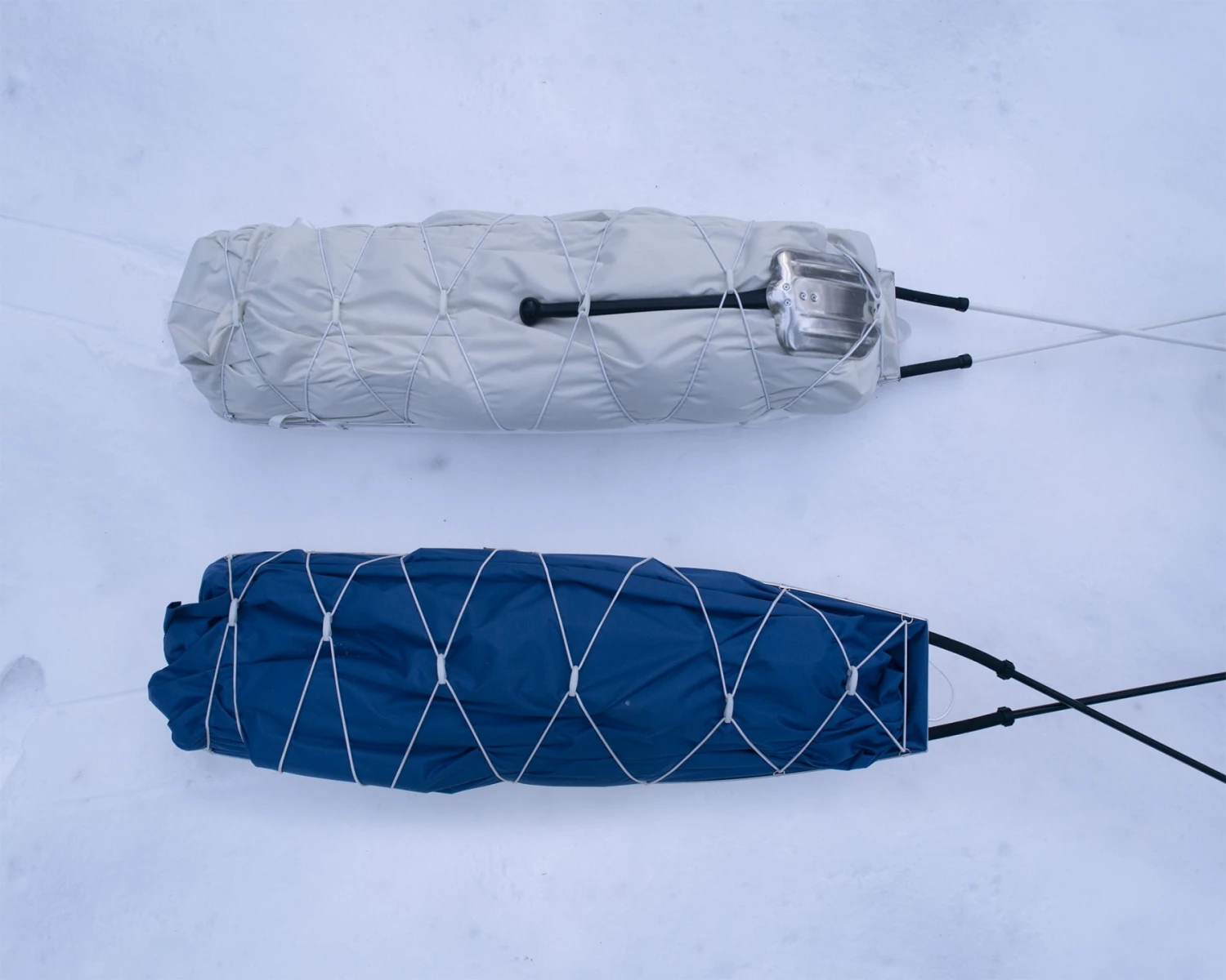 La barre de traction est sertie dans le bac en fibres avec 2 timons souples, tandis que le brancard est composé de 2 brins en acier qui s’emboitent l’un dans l’autre. A l’intérieur des tubes, la cordelette permet d’assembler le tout et est géré depuis le harnais de traction. Le brancard rigide se replie à l’intérieur de la pulka, facilitant son transport.