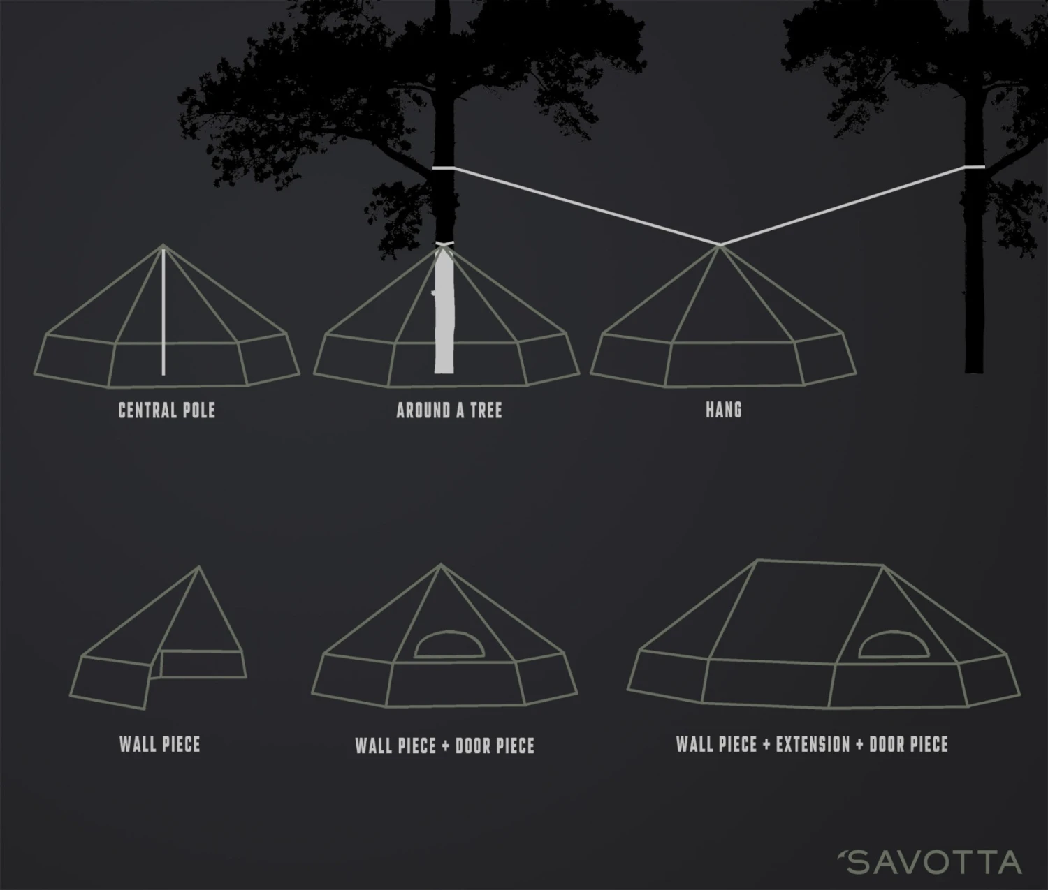 - Wall Piece : il s’agit d’un élément (la moitié de la tente qui peut être monté seule (en mode Loue) avec un mat télescopique par exemple (vendu séparément).