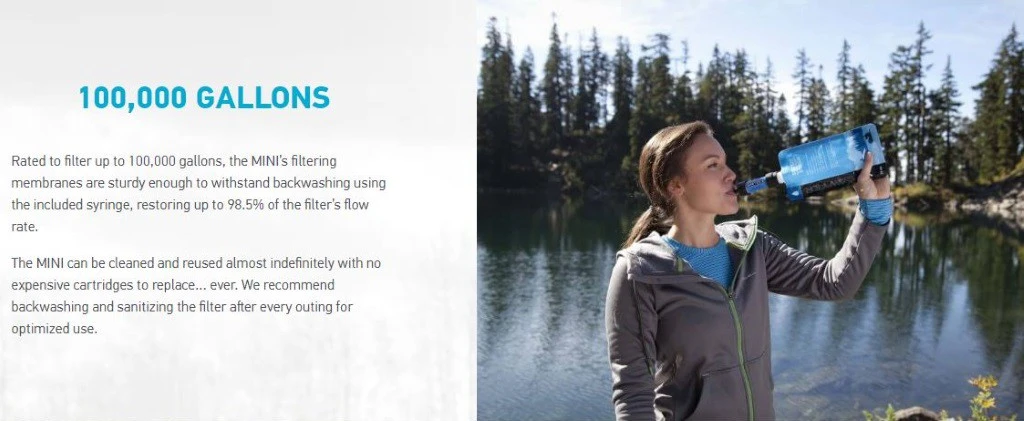 Ce filtre à eau peut être fixé à la gourde souple livrée avec, à une bouteille jetable. Il est compatible avec les poches à eau avec tuyaux. Vous pouvez l’utiliser pour boire directement depuis un point d’eau (rivière, ruisseau, lac, torrent…). Ce filtre ultra-léger a un débit de 1,7 litres/minute. Il ne pèse que 38 grammes.